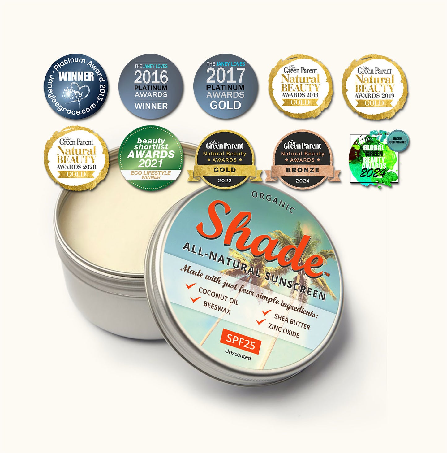 Award winning product since 2015 Shade contains only 4 natural ingredients which together nourish and protect skin from damaging UVA and UVB rays. Shade keeps your skin naturally healthy whilst blocking rays that can burn and cause sun damage. Suitable for all skin types and all ages.