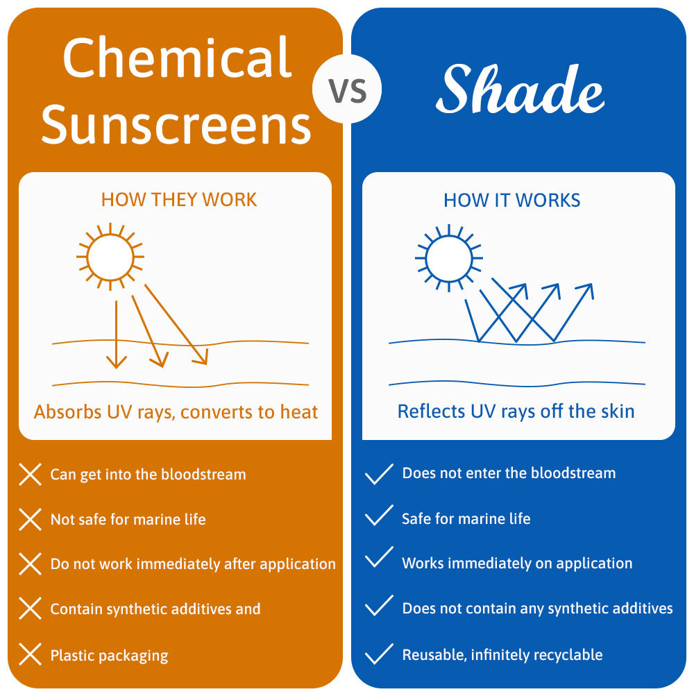 Shade contains no toxic chemicals, no unnecessary fragrances, no liquid polymers, and no microplastics. Shade works immediately upon application as a physical barrier against UV rays.